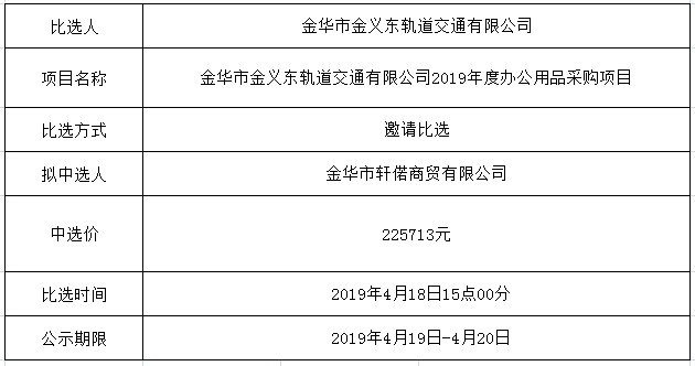 中選公示(金華市金義東軌道交通有限公司2019年度辦公用品采購(gòu)項(xiàng)目)