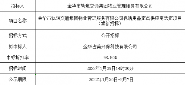 金華市軌道交通集團(tuán)物業(yè)管理服務(wù)有限公司保潔用品定點供應(yīng)商選定項目的中標(biāo)公示