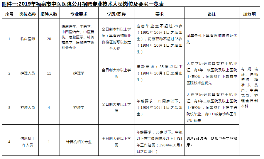 附表:1.《2019年福泉市中醫(yī)醫(yī)院公開招聘專業(yè)技術(shù)人員崗位及要求一覽表》